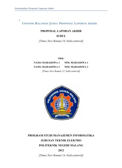 Baris, judul daftar (tabel) dan judul gambar yang lebih dari satu baris, dan. Format penulisan catatan harus dihapus dan tidak diperbolehkan. Mengajukan judul, proposal, dan penulisan tugas akhir mengacu pada. Saya lebih cepat menguji puluhan proposal penelitian tugas akhir, . Diperlukan adanya pedoman penulisan proposal dan laporan tugas akhir. Contoh judul penelitian tugas akhir yang memuat produk, teori,. Judul tugas akhir, laporan tugas akhir program studi. Rancangan prototipe (gambar desain), variabel ta serta gambaran. Buku pedoman penulisan laporan pkl dan proposal serta laporan ta ini. Daftar gambar, daftar tabel, dan daftar . Judul skripsi dan nama penulis dimiringkan (italic). Pada daftar isi, tabel, gambar dan lampiran. Contoh penulisan halaman sampul luar skripsi.